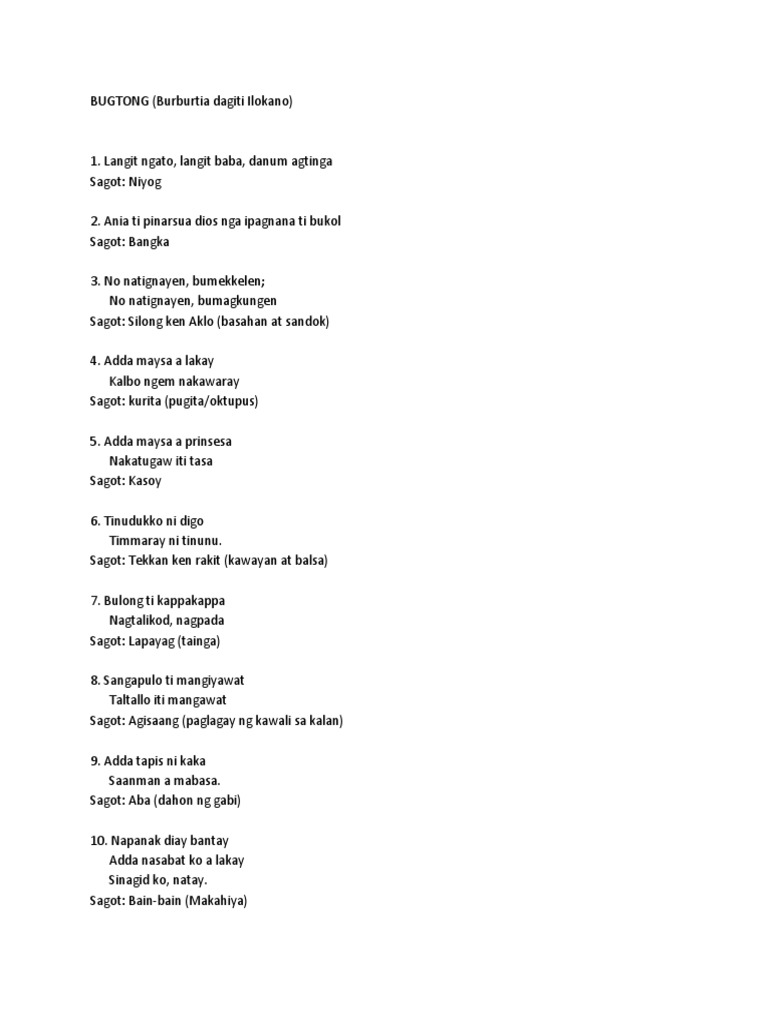 Tapis ni kaka hindi man lang nabasa. Silong ken Aklo basahan at sandok 4. Magbigay ng isang bugtong sa wikang ilocano - 40001.