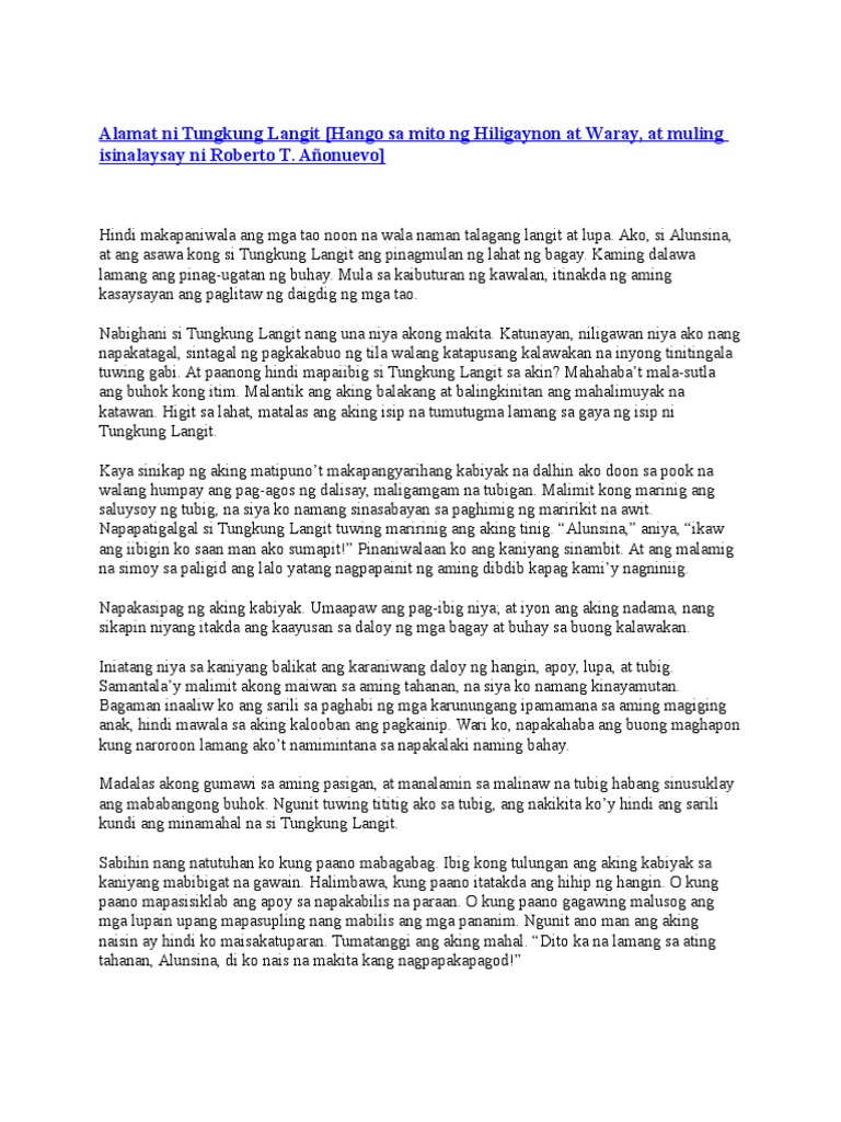 What was the reaction of tungkung langit upon knowing that alunsina ordered the breeze to spy on. Alamat ni Tungkung Langit Hango sa mito ng Hiligaynon at Waray at muling isinalaysay ni Roberto T. Tungkung langit took the.
